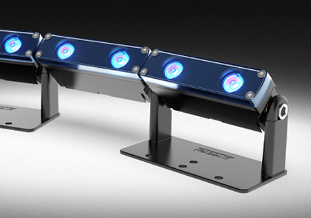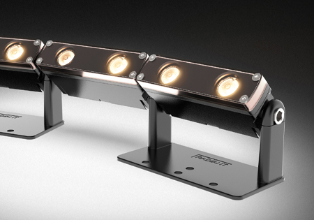 The patented articulated joint system joining the heat sinks allows the system to follow curved building surfaces while maintaining a 25 mm spacing between LEDs, thus ensuring continuous lit effects without shadows or dark areas.